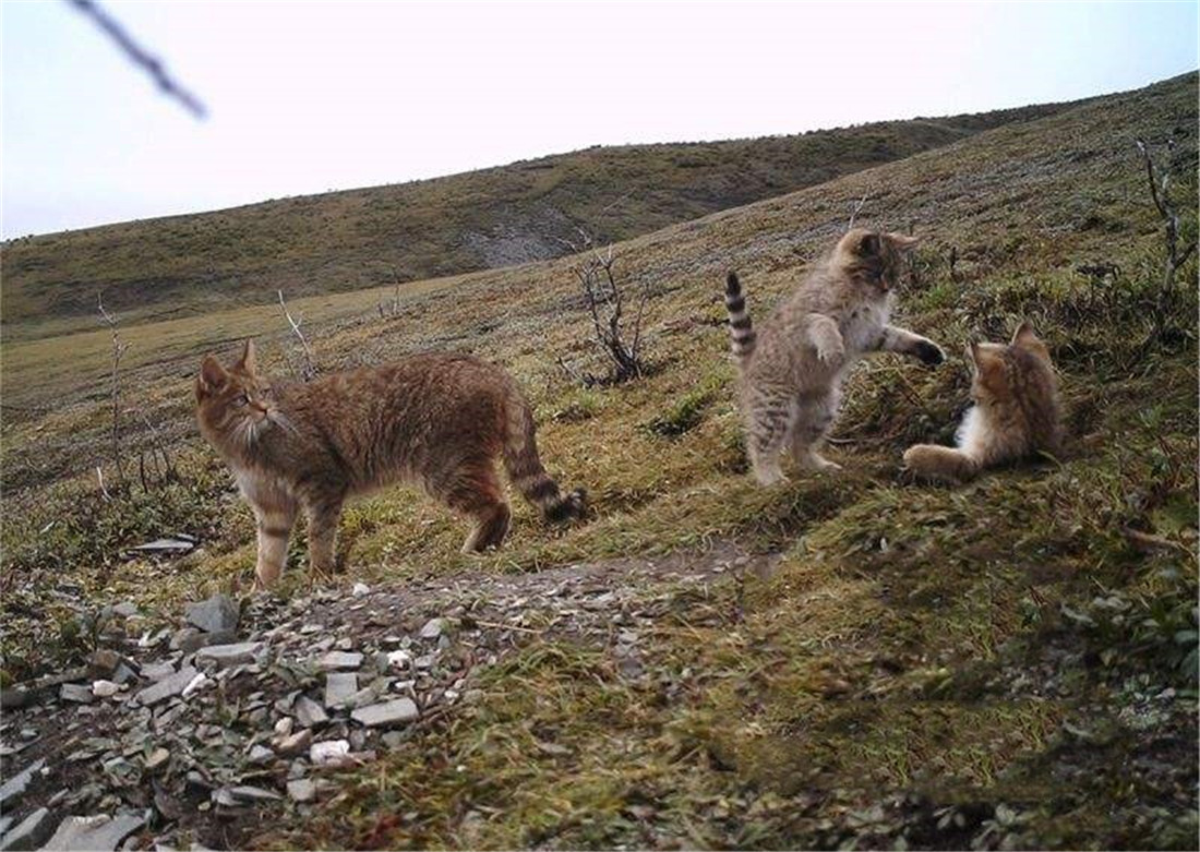 隨着小貓逐漸長大,母乳不足以餵養它們了。母貓讓小貓崽躲在洞里,自己去抓高原鼠兔。回來后,在洞外邊發出“咕咕”的叫聲,呼喚小貓出來。